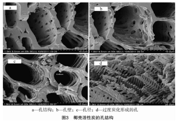 圖3為椰殼炭的電子顯微鏡掃描照片,可以更清楚地觀察到椰殼炭的孔結構。