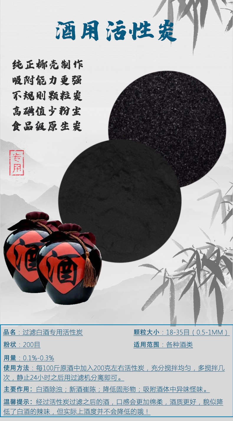 總體來說,酒用活性炭在酒類生產中起到了很好的作用,但是需要注意正確使用,以避免對酒質造成不利影響。