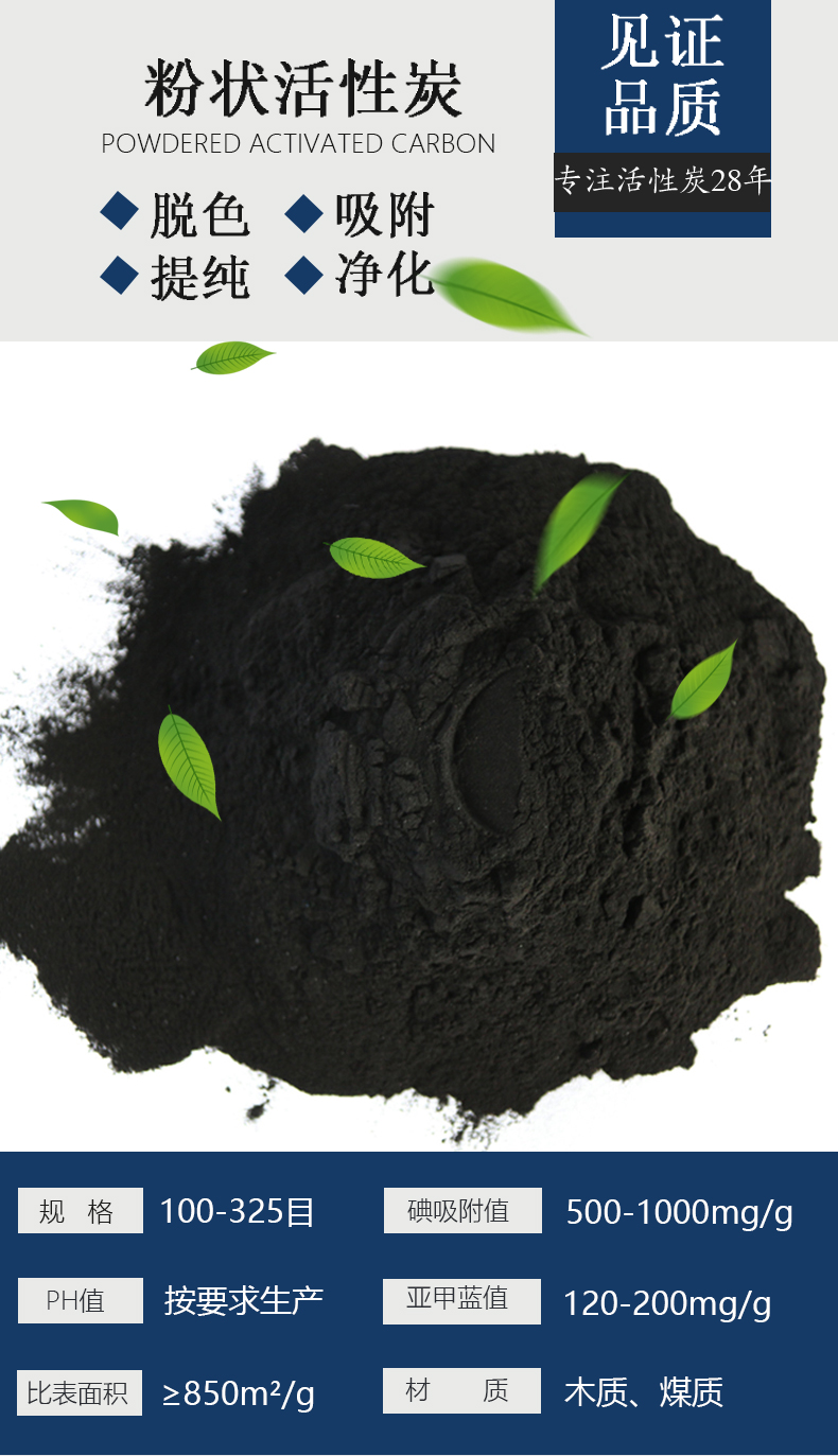 粉狀活性炭的質量有多項物理與化學的指標,主要的如:水分、灰分、酸溶物、各種金屬和酸根的含量,以及它的吸附性能等。對于不同用途的活性炭,時常用不同的物質和方法來檢驗它的吸附性能,如亞甲基藍吸附值、碘吸附值、焦糖吸附值、硫酸奎寧吸附值等。其中亞甲基藍吸附值是較常用的。亞甲基藍是一種深藍色染料,對它的吸附量反映了活性炭吸附小分子物質的能力;具有大量微孔的活性炭,此值較高。焦糖吸附值(或稱焦糖脫色率、或糖蜜吸附率)是反映活性炭對具有較高分子量的有色物質的吸附性能,性能良好的活性炭,此值達到100~110。