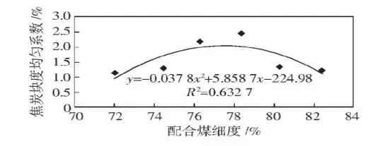 焦炭塊度均勻系數(shù)隨著配合煤細(xì)度的增加呈拋物線形式, 在約77%時達(dá)最大值。為了提高焦炭的大塊率, 因而配合煤細(xì)度也不易過高, 經(jīng)測算細(xì)度為76%時, 焦炭大塊率較好。