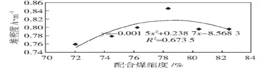 配合煤細(xì)度對配合煤堆密度、焦炭機(jī)械強(qiáng)度、熱強(qiáng)度及焦炭產(chǎn)量的影響, 用來指導(dǎo)實際生產(chǎn);在一定條件下, 按照實際使用的配比, 進(jìn)行不同細(xì)度下配合煤, 尋找配合煤細(xì)度與焦炭質(zhì)量、產(chǎn)量的對應(yīng)關(guān)系。