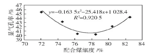 焦炭顯氣孔率隨著配合煤細(xì)度的增加呈拋物線形式, 在約77.5%時為最低值。